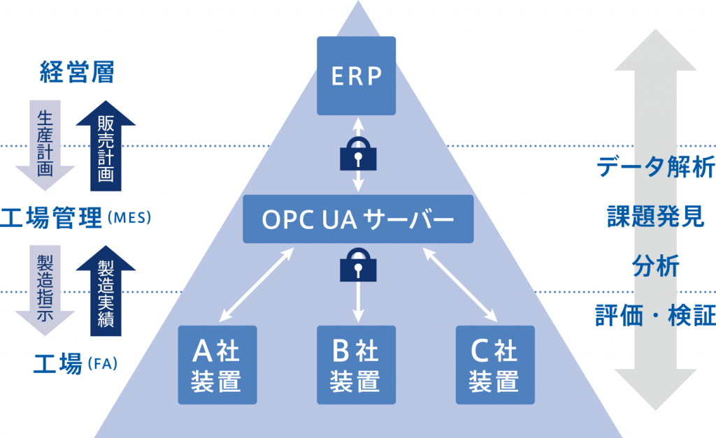 OPC UA(オーピーシー ユーエー)とは、世界標準規格に準拠したIoTを実現するための技術のひとつで、IoTの最大の課題となるセキュリティの面も最高ランクに位置づけられています。Industry 4.0の先駆けであるドイツやアメリカ等のIoTを推進している国では、すでに幅広く使われています。